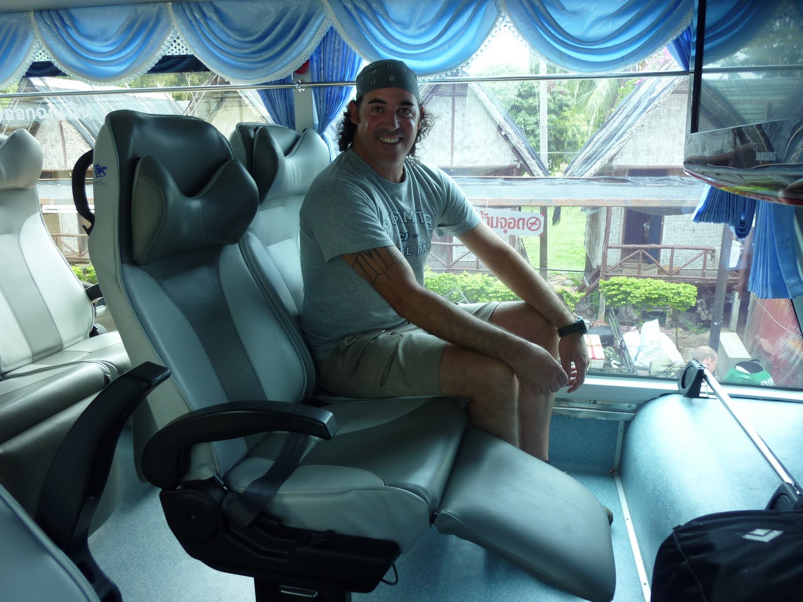 LA PERIPETIE ,,,, Le bus Thai ,,,, ils vendent des tickets sans se soucier si les gens vont avoir une place assise ou non ,,, oups ,,, le chauffeur a fait tasser des petites etudiantes thai a 3 personnes sur 2 fauteuils de bus pour qu on puisse s assoeir sauf qu il voulait un tip ( il a meme voulu rentrer sa main dans la poche de pantalon a Michel pour y prendre de l argent jusqu a ce que Michel s offusque,,,, bref nous n avons rien payer d extra ) ,,,,,,,,,ensuite ,,,,, le trajet ,, des gens debout qui morvent , s endorment et cante sur Michel, d autres se penche le derriere sur Michel pendant 5 min,,, lol ,,,,,,,,,De mon cote ( Rien de tout cela ) je n etais pas assise a cote de Michel ,,
