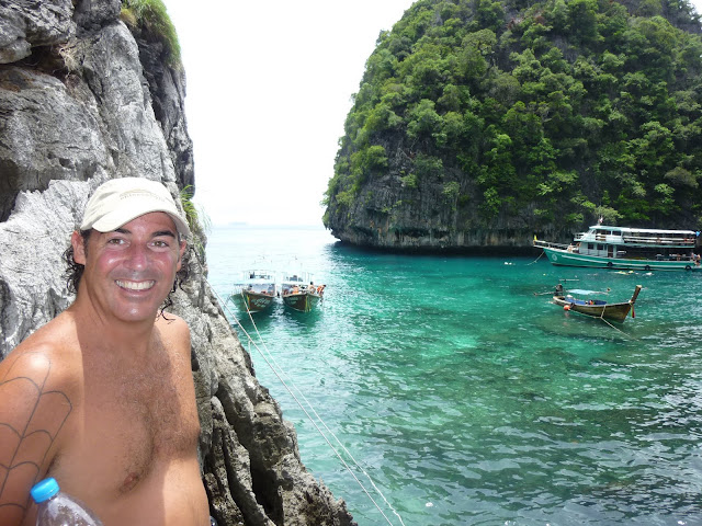 Le Defi ::::::::::::::::: 5-6 hrs a pagayer pour faire le demi tour de l ile de Koh Phi Phi .....et puisque nous avons debarquer a l oppose de notre point de depart ( la plage de tom sai avec son port a bateaux ),,,, il fallait de surcroit faire 1h de portage pour ramener le kayak ,,,,,,,,,,,,,,,,,,,,,,,,durant notre continuation , le point culminant qui nous a encourage a continuer fut la presence de dechets flottant sur l eau lol ,,,,on se rapprochait du port ( le trajet se ressemblait dans chaque tournant qui longe la face rocheuse et completement verticale de l ile ( semblable au rocher perce de la gaspesie )