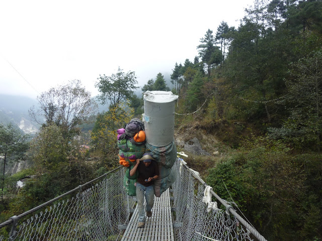 un nepalais traversant le pont suspendu